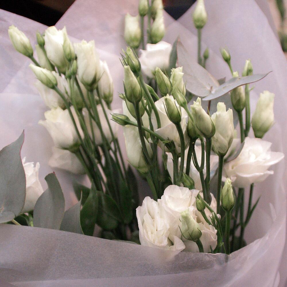 Эвкалипт – 1 шт.Эустома – 5 шт.Тишью – 2 шт.Атласная лента – 2 шт.Матовая пленка – 2 шт.