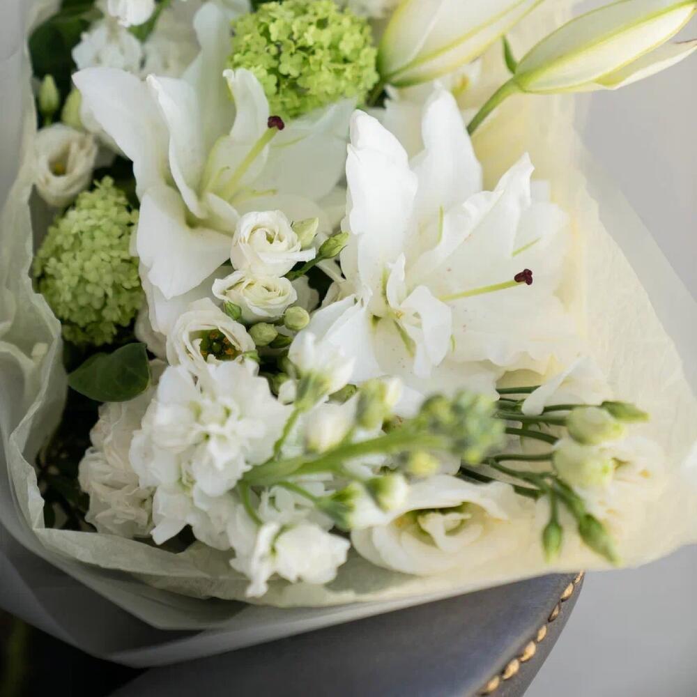 Вибурнум – 3 шт.Лизиантус – 3 шт.Маттиола – 3 шт.Лента атласная – 1 шт.Упаковка дизайнерская – 6 шт.лилия дабл – 1 шт.