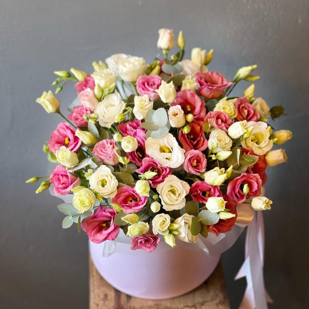 Красивый букет из эустомы розового и белого цвета на день рождения, сестре, подруге, маме, бабушке или просто так, в стильной упаковке . Идеальный подарок на любое торжество. Лизиантусы подойдут юной девушке или взрослой даме. Красивые цветы букет в коробке смотрится очень … Показать ещёромантично , чтобы цветы в коробке простояли долго доливайте воду в оазис. К букету вы можете выбрать воздушные шары, топер, открытку. Мы подпишем открытку и вовремя доставим адресату.
