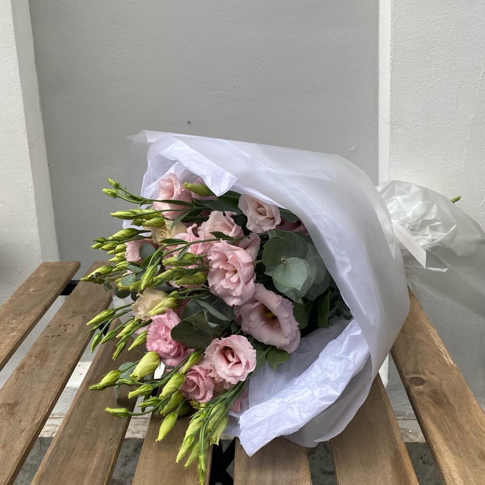 Лизиантус махровый розовый – 7 шт.Эвкалипт – 2 шт.Тишью – 2 шт.Упаковка дизайнерская – 4 шт.лента атласная брендированная красная – 1 шт.