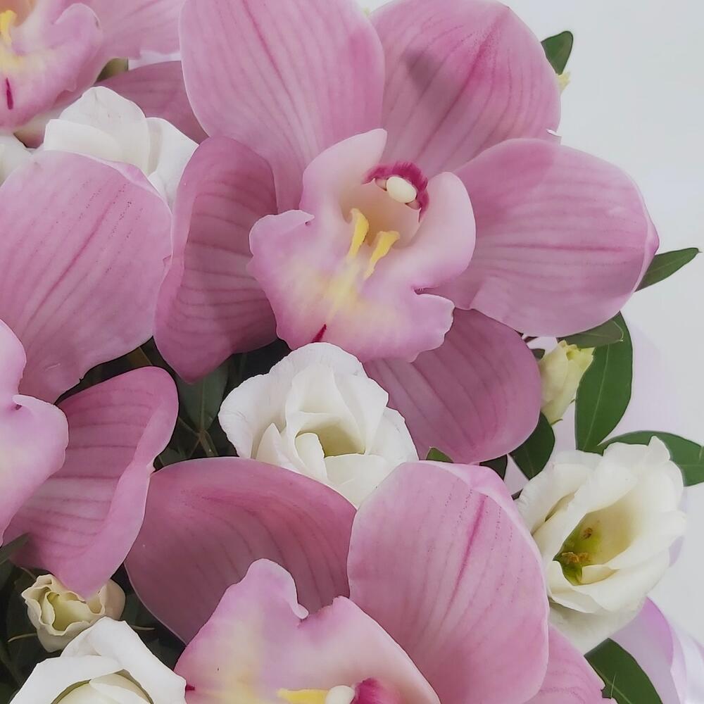 Розовые орхидеи с эустомой в коробке