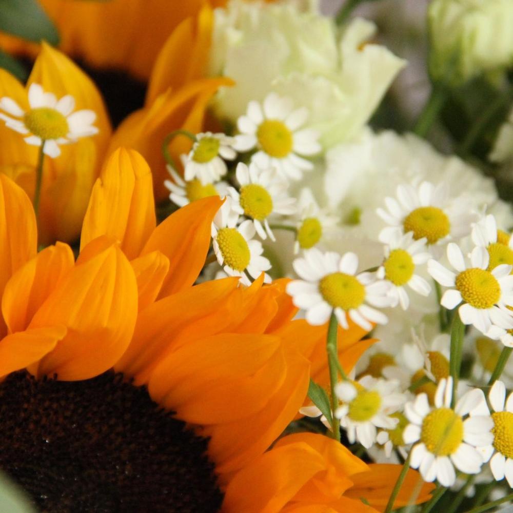 Яркий солнечный букет с ромашками, подсолнухами, лизиантусом и травами.Стильное цветочное решение для любого случая