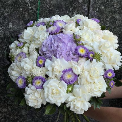 гортензии сиреневые – 6 шт. Орхидея Фаленопсис ветка – 2 шт. розы – 35 шт. Эвкалипт – 4 шт. Трахелиум – 9 шт. пионовидные спрей розы – 15 шт.
