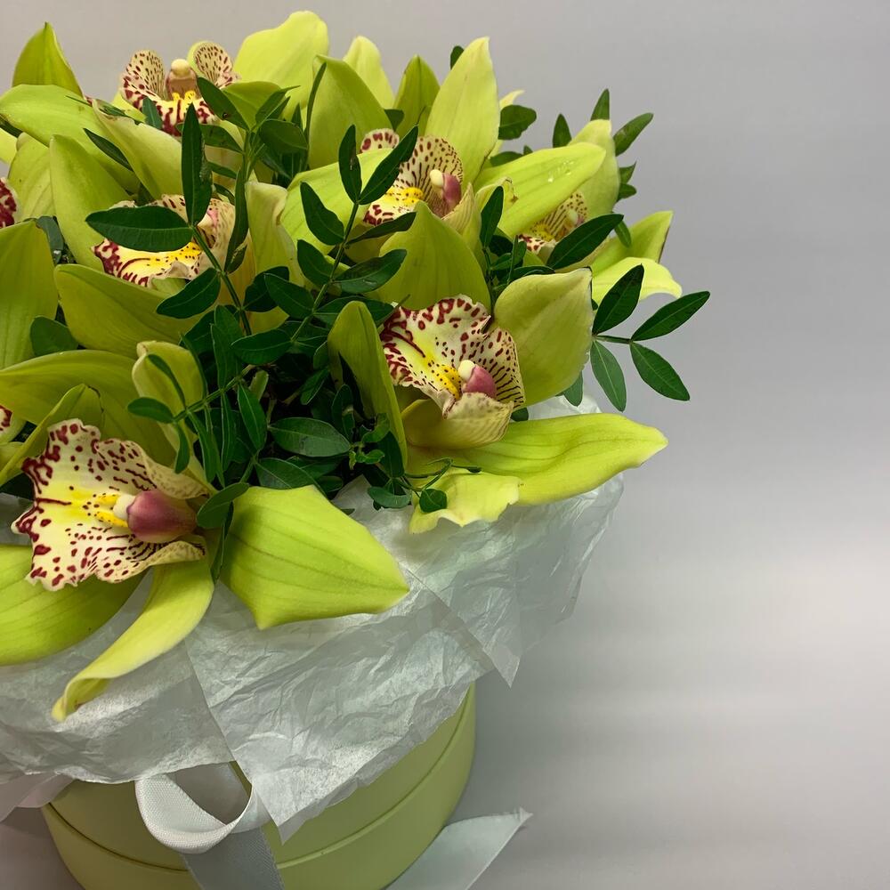 Орхидея Цимбидиум – 11 шт.Фисташка – 2 шт.Шляпная коробка – 1 шт.