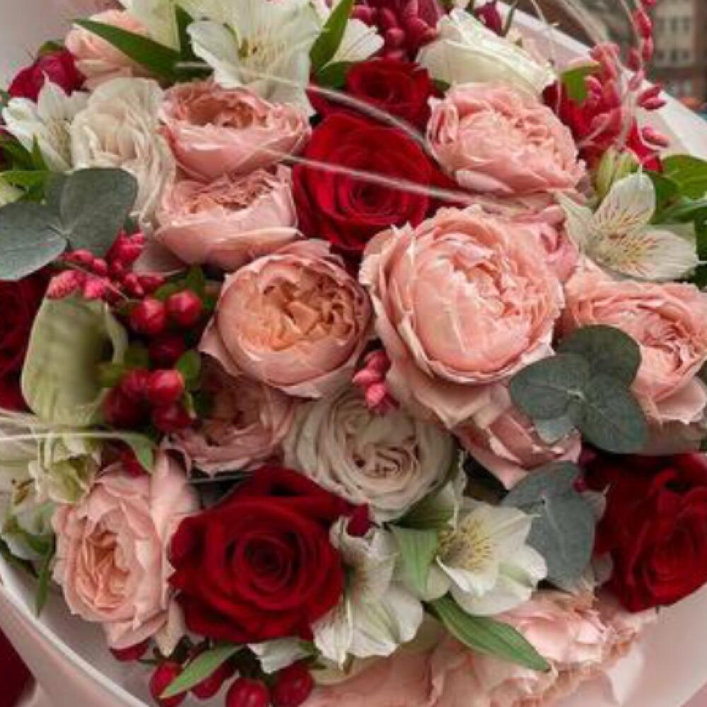 Альстромерия – 7 шт.Красная роза – 9 шт.Пленка матовая – 2 шт.Red Piano роза – 4 шт.джульетта роза пионовидная – 7 шт.Фоамиран (упаковка) – 2 шт.бриза сухоцвет – 10 шт.white o’hara – 3 шт.