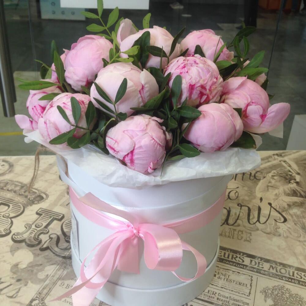 15 пионов в шляпной коробка с фисташкой – 1 шт.Пион Сара Бернар – 15 шт.Фисташка – 3 шт.Коробка шляпная – 1 шт.Оазис флористический – 1 шт.Лента атласная – 1 шт.