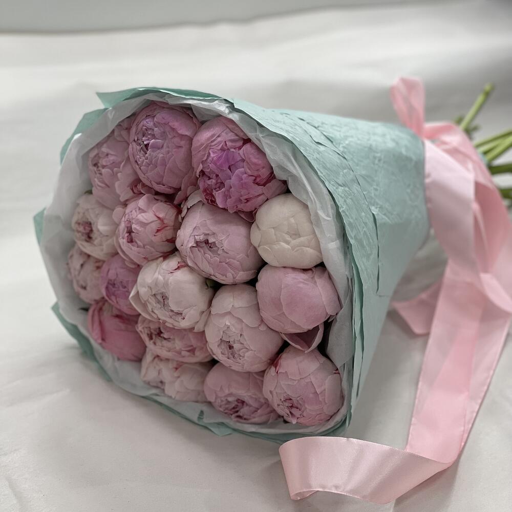 Атласная лента – 1 шт.Пион Сара Бернар – 17 шт.Дизайнерская упаковка – 1 шт.открыточка – 1 шт.