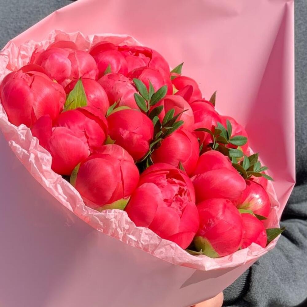 3 коралловых пиона с эвкалиптом