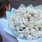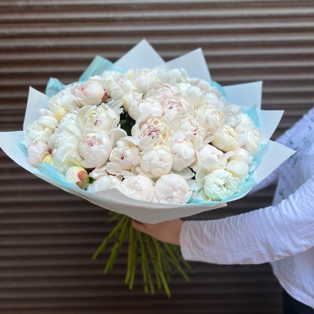 Лента атласная – 2 шт.Пион белый – 51 шт.Дизайнерская упаковка – 3 шт.