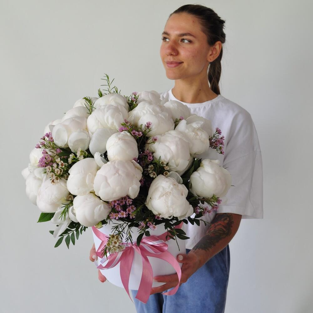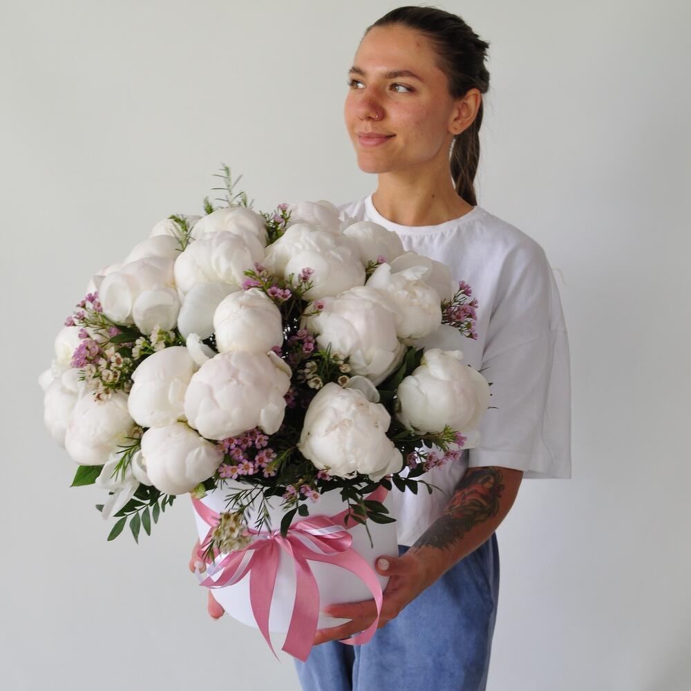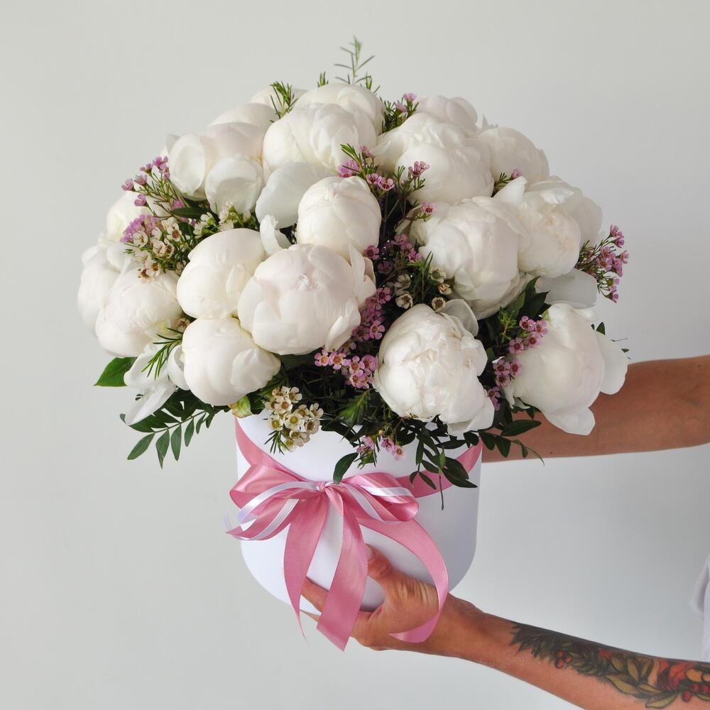 Коробка шляпная – 1 шт.Хамелациум – 3 шт.Пион белый – 25 шт.Оазис флористический – 2 шт.зелень декоративная – 6 шт.