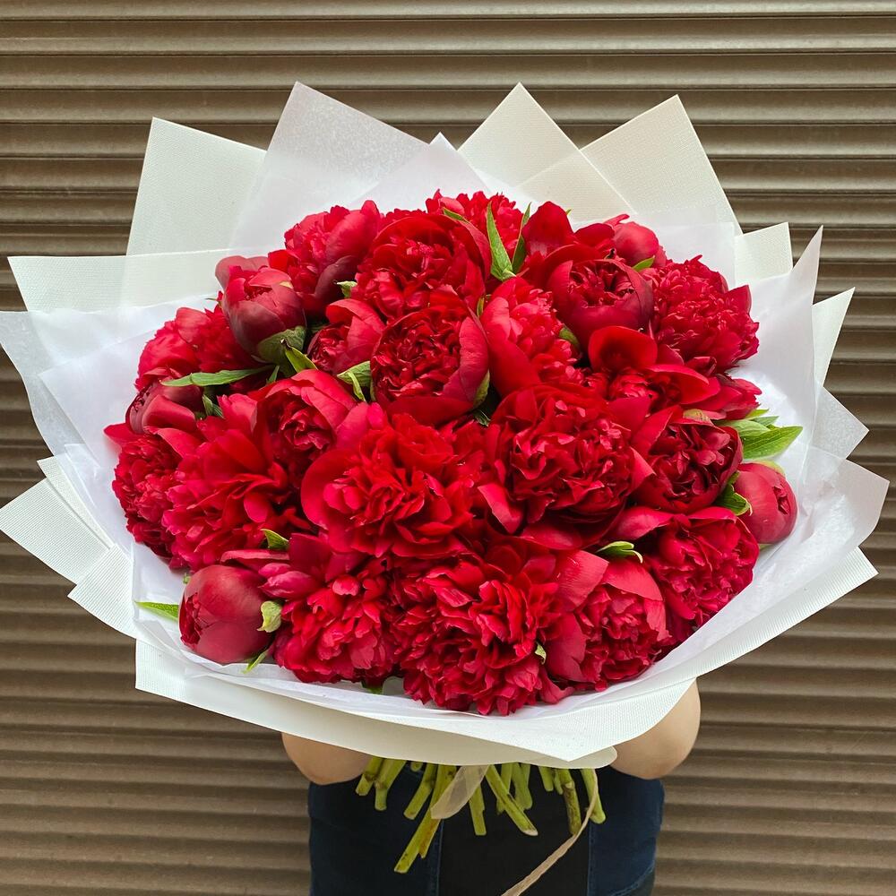 Лента атласная – 1 шт.Пион красный – 35 шт.Тишью белое – 2 шт.Пленка дизайнерская – 3 шт.