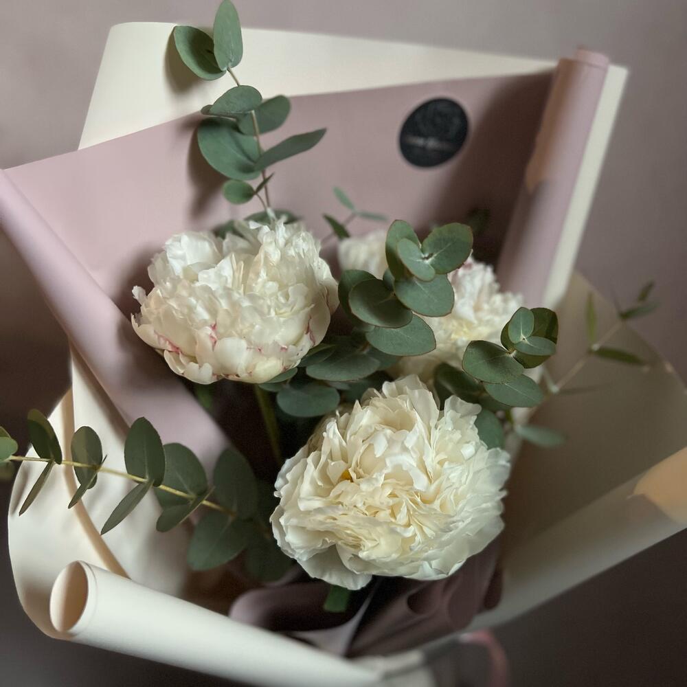 Эвкалипт – 6 шт.Атласная лента – 1 шт.декоративная упаковка – 1 шт.пионы – 3 шт.