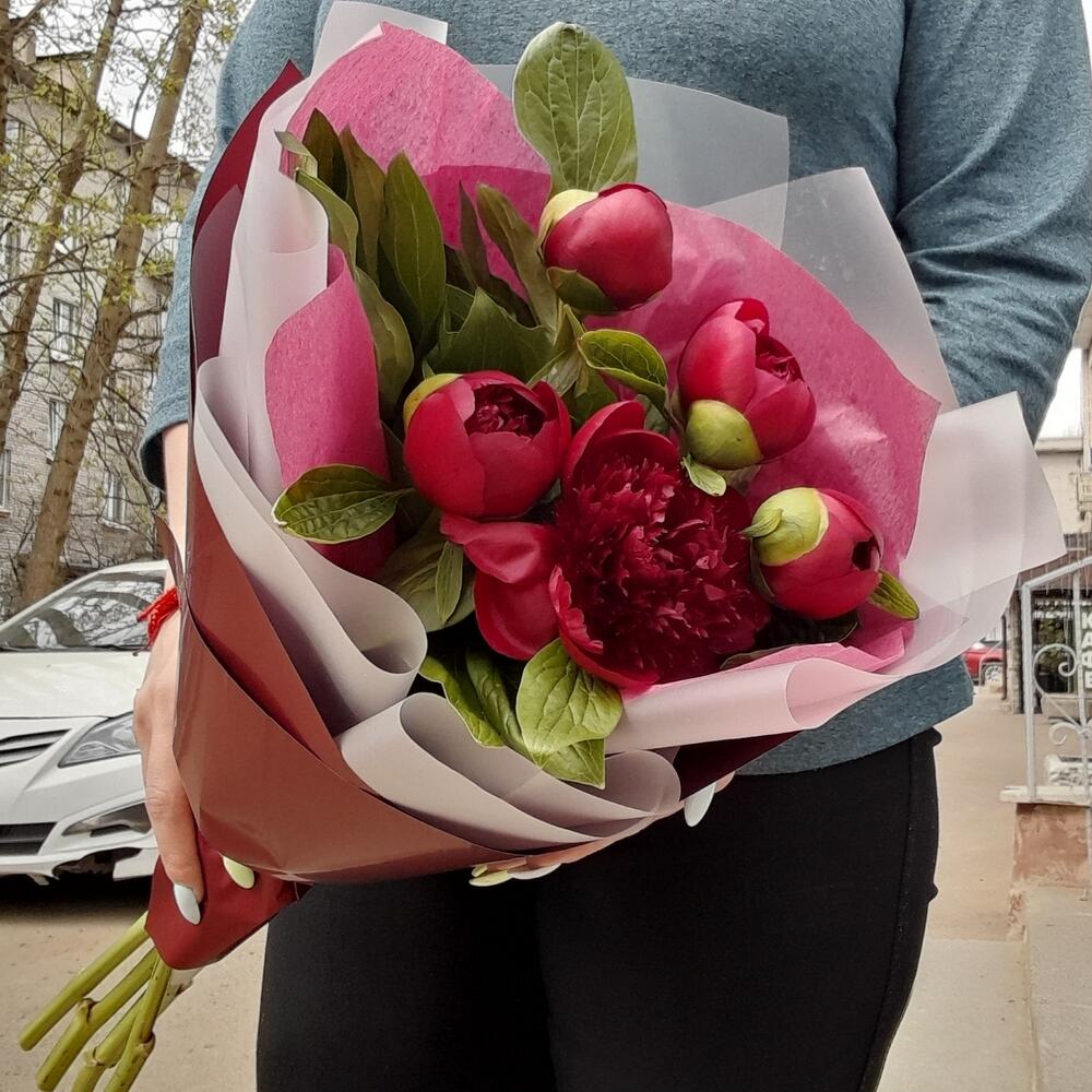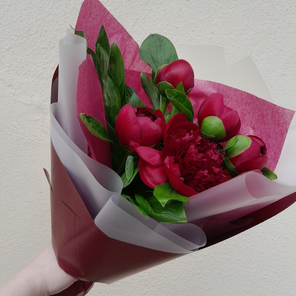 Пион – 5 шт.Лента атласная – 2 шт.Упаковка дизайнерская – 3 шт.