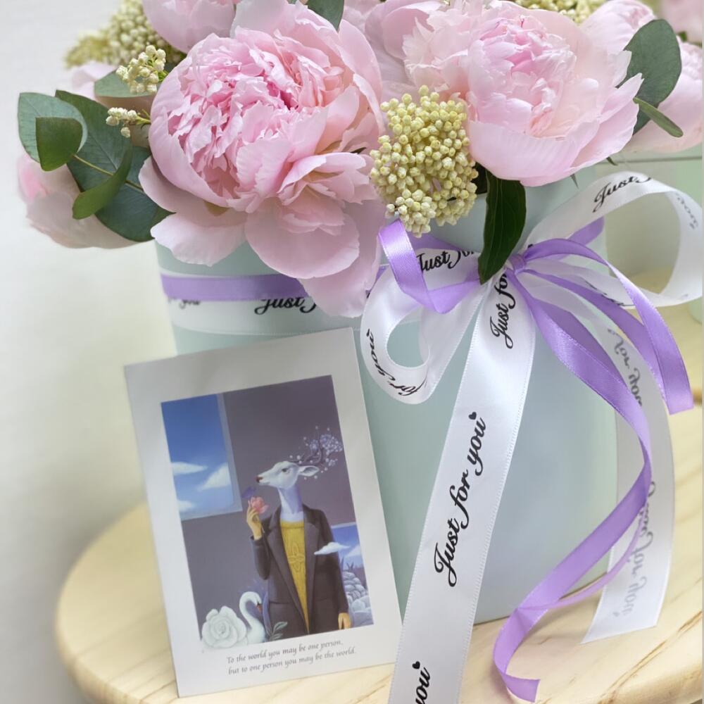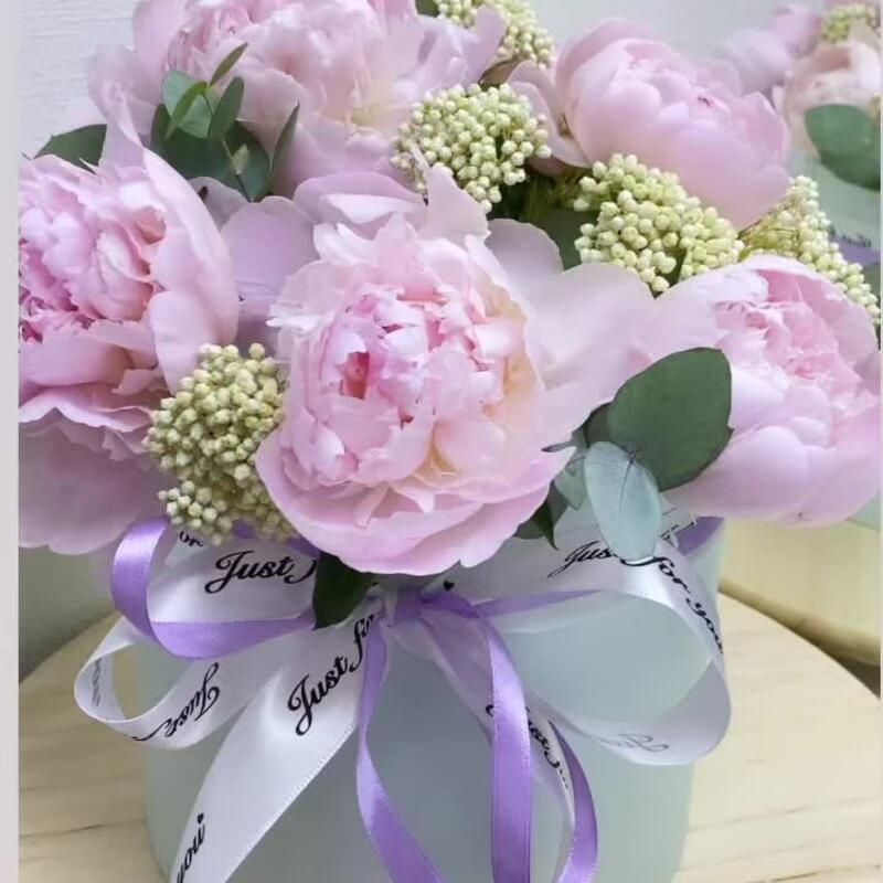 Озотамнус – 5 шт.Эвкалипт – 1 шт.Лента атласная – 2 шт.Коробка шляпная – 1 шт.пионы – 11 шт.