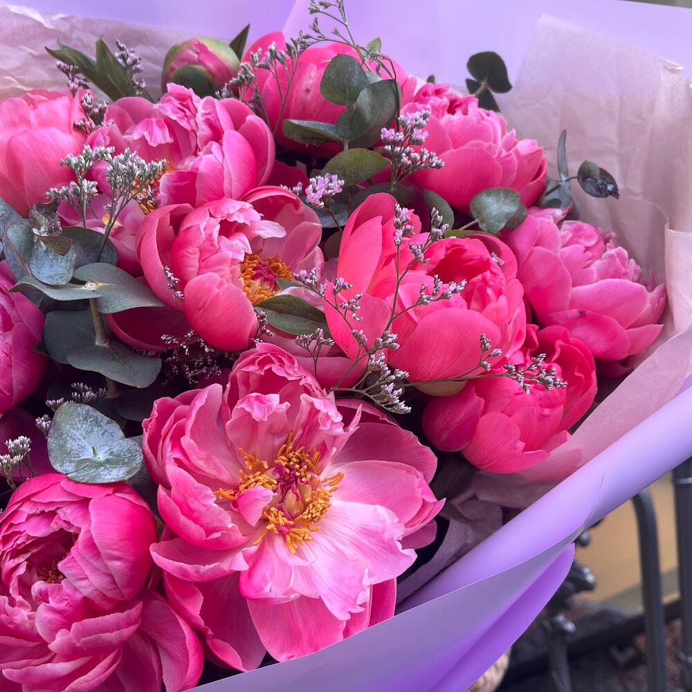 Эвкалипт – 7 шт.Лента атласная – 2 шт.Лимониум сиреневый – 4 шт.пион коралл шарм премиум – 15 шт.упаковка корейская пленка лавандовая – 1 шт.тишью крафтовое – 2 шт.