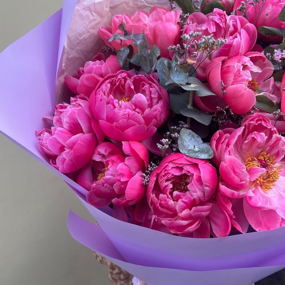 ПРЕМИУМ ШАРМ огромный букет из 15 пионов с эвкалиптом и лимониумом