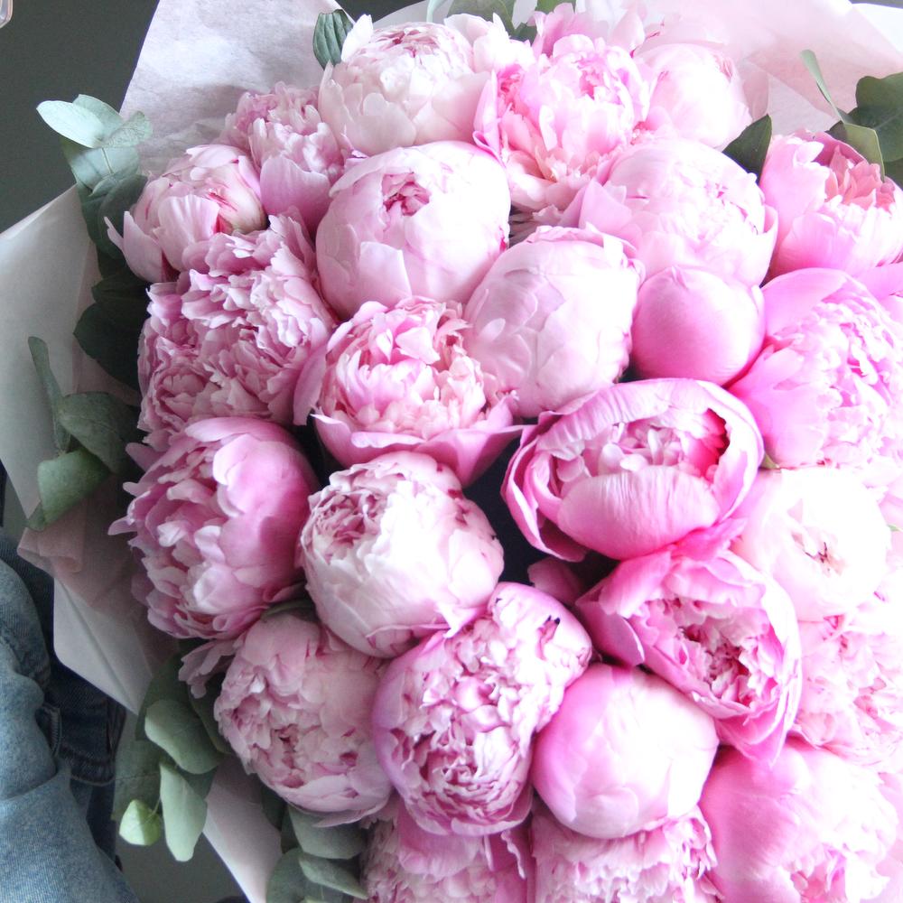 Роскошный букет из 29 голландских пионов Сара Бернар.Стильное цветочное решение для любого случая.Ширина букета около 60 сантиметров, высота пионов около 65 сантиметров.