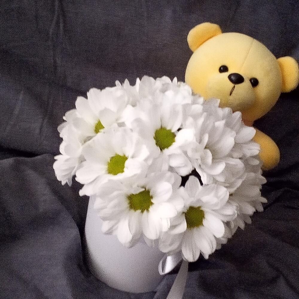 Ромашка – 17 шт.Мишка плюшевый – 1 шт.Флористическая губка – 1 шт.шляпная коробка 12х12 – 1 шт.