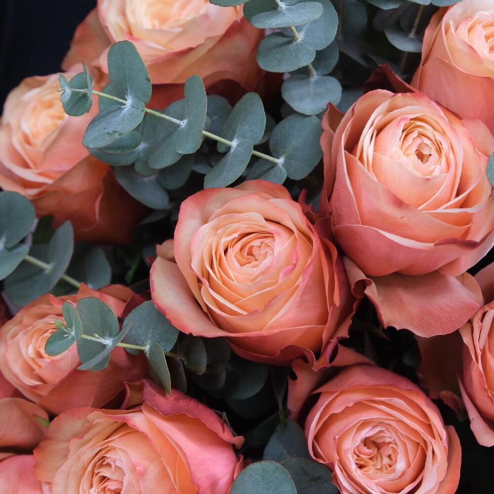 15 пионовидных роз Кахала с веточками эвкалипта