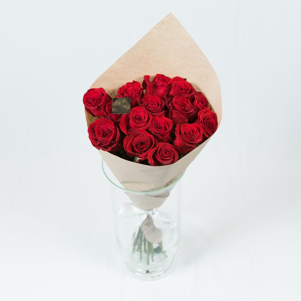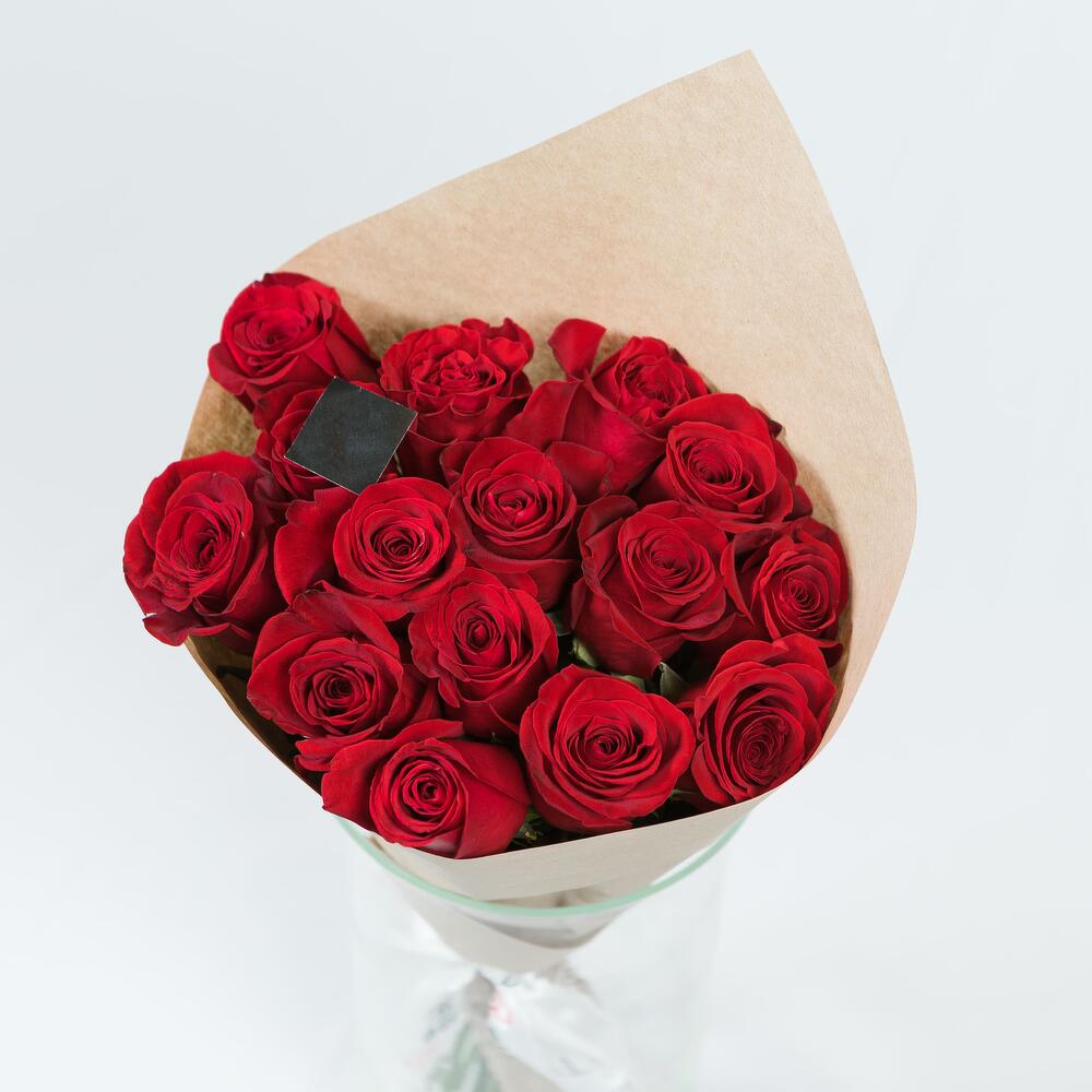 Роза Эквадор – 15 шт.Лента атласная – 1 шт.Крафт дизайнерский – 1 шт.