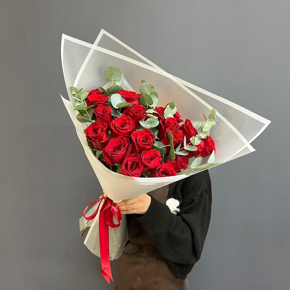 21 красная роза с эвкалиптом