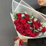 Эвкалипт – 7 шт.Атласная лента – 1 шт.Роза Эквадор 60 см – 21 шт.Дизайнерская упаковка – 1 шт.