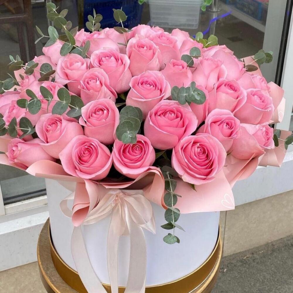 Роза розовая – 51 шт.Шляпная коробка – 1 шт.Эвкалипт – 10 шт.Открыточка с вашими пожеланиями – 1 шт.хорошее настроение – 100 шт.инструкция по уходу за цветами – 1 шт.Кризал – 1 шт.