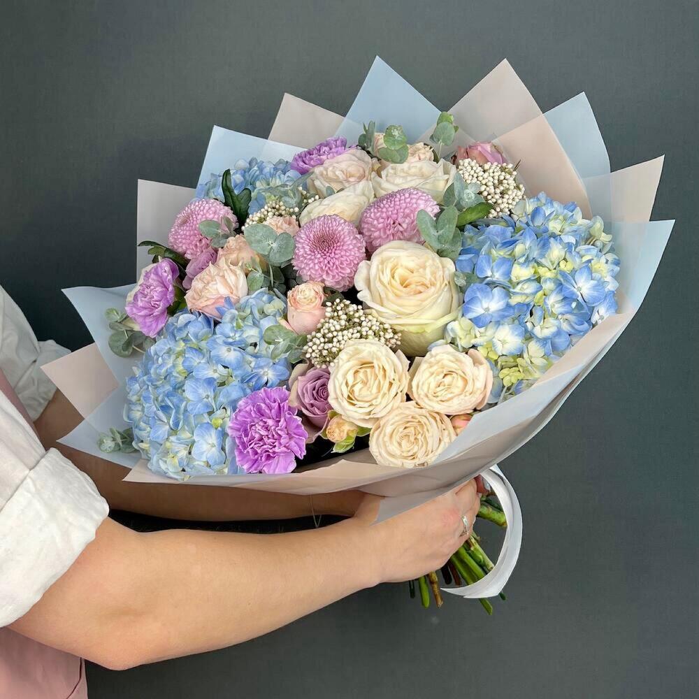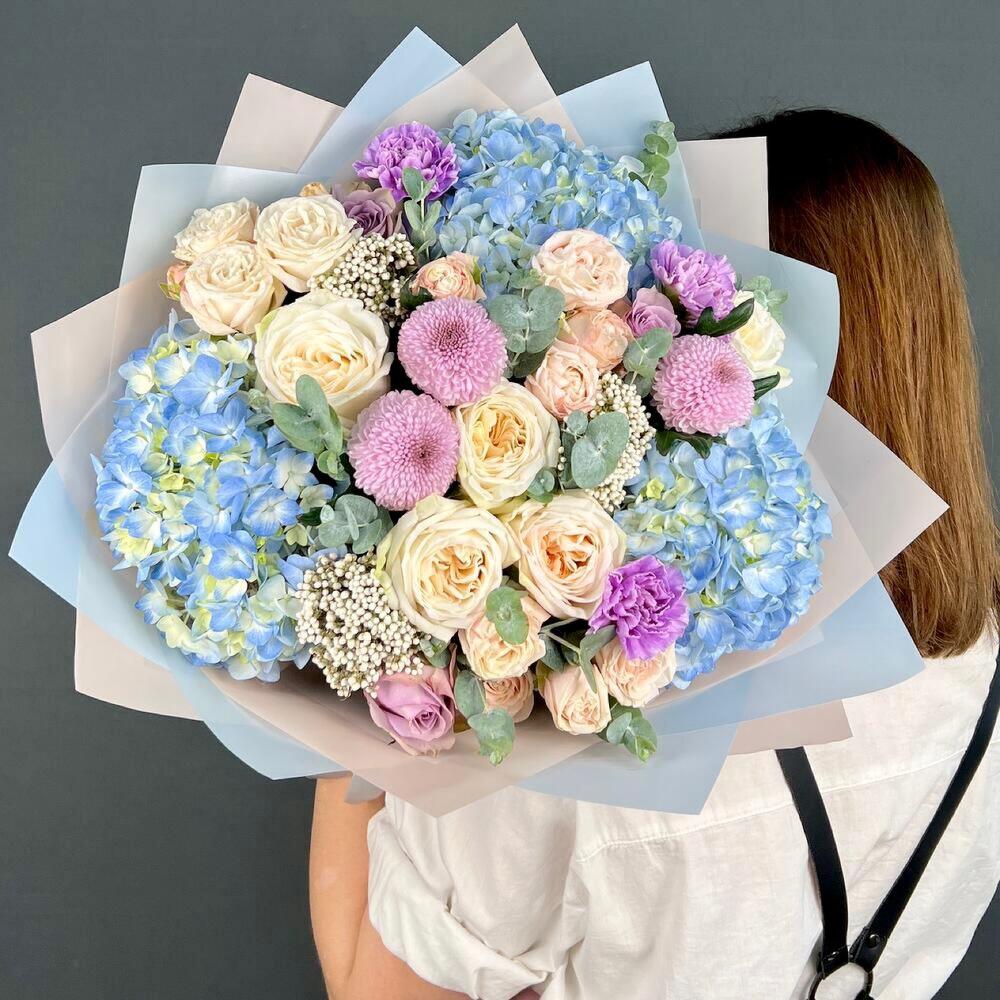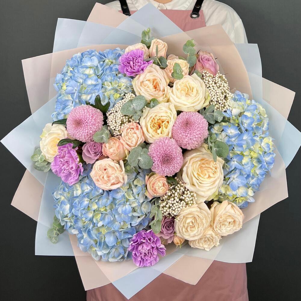 Авторский букет из голубой Гортензии, пионовидных Роз и Хризантемы Момоко