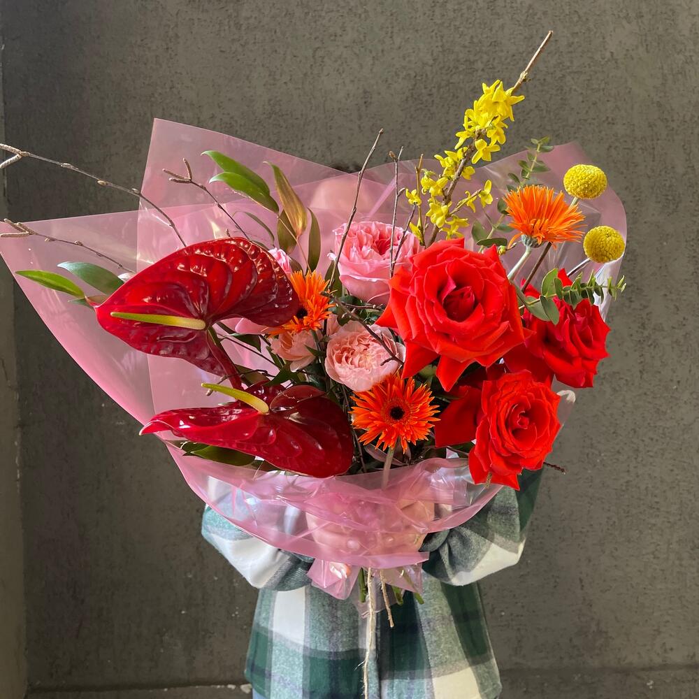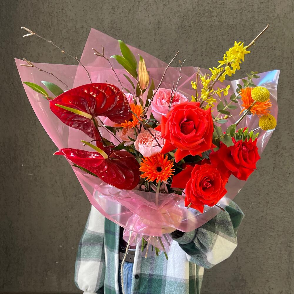 Пионовидная роза – 5 шт.Антуриум – 2 шт.Гербера сортовая – 3 шт.Форзиция – 1 шт.Краспедия – 2 шт.Зелень – 5 шт.Роза кустовая пионовидная – 1 шт.Упаковка дизайнерская – 3 шт.