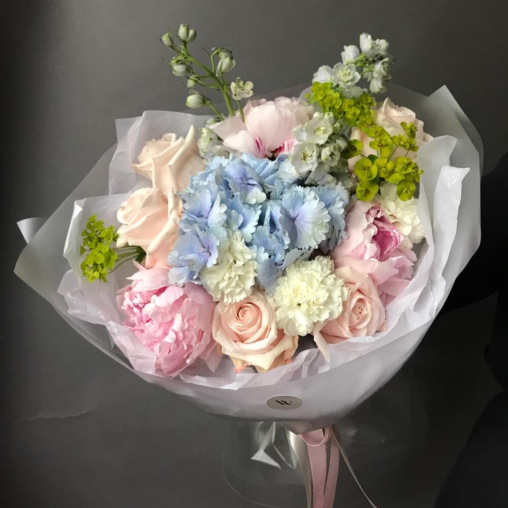 Роза одноголовая – 5 шт.Пион – 3 шт.Гортензия – 1 шт.Дельфиниум – 3 шт.Диантус – 5 шт.Эуфорбия – 3 шт.Упаковка дизайнерская – 1 шт.Лента атласная – 1 шт.Открыточка с вашими пожеланиями – 1 шт.