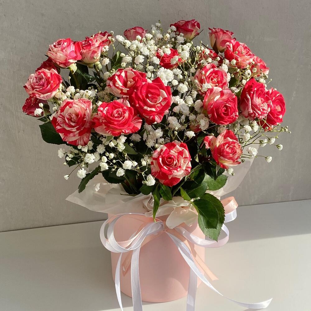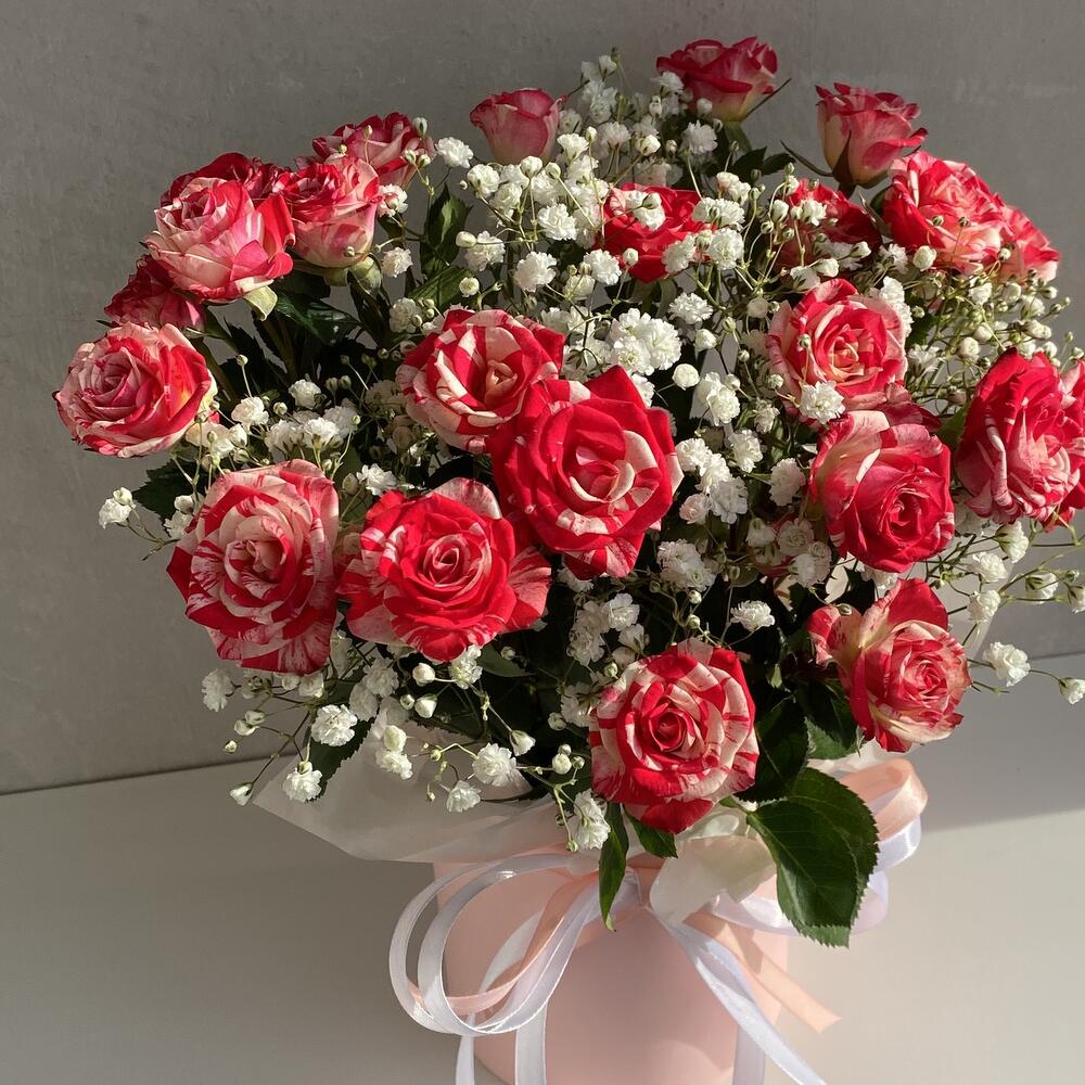Гипсофила – 1 шт.Роза кустовая – 5 шт.Лента атласная – 3 шт.Тишью – 1 шт.Коробка шляпная – 1 шт.Оазис флористический – 1 шт.