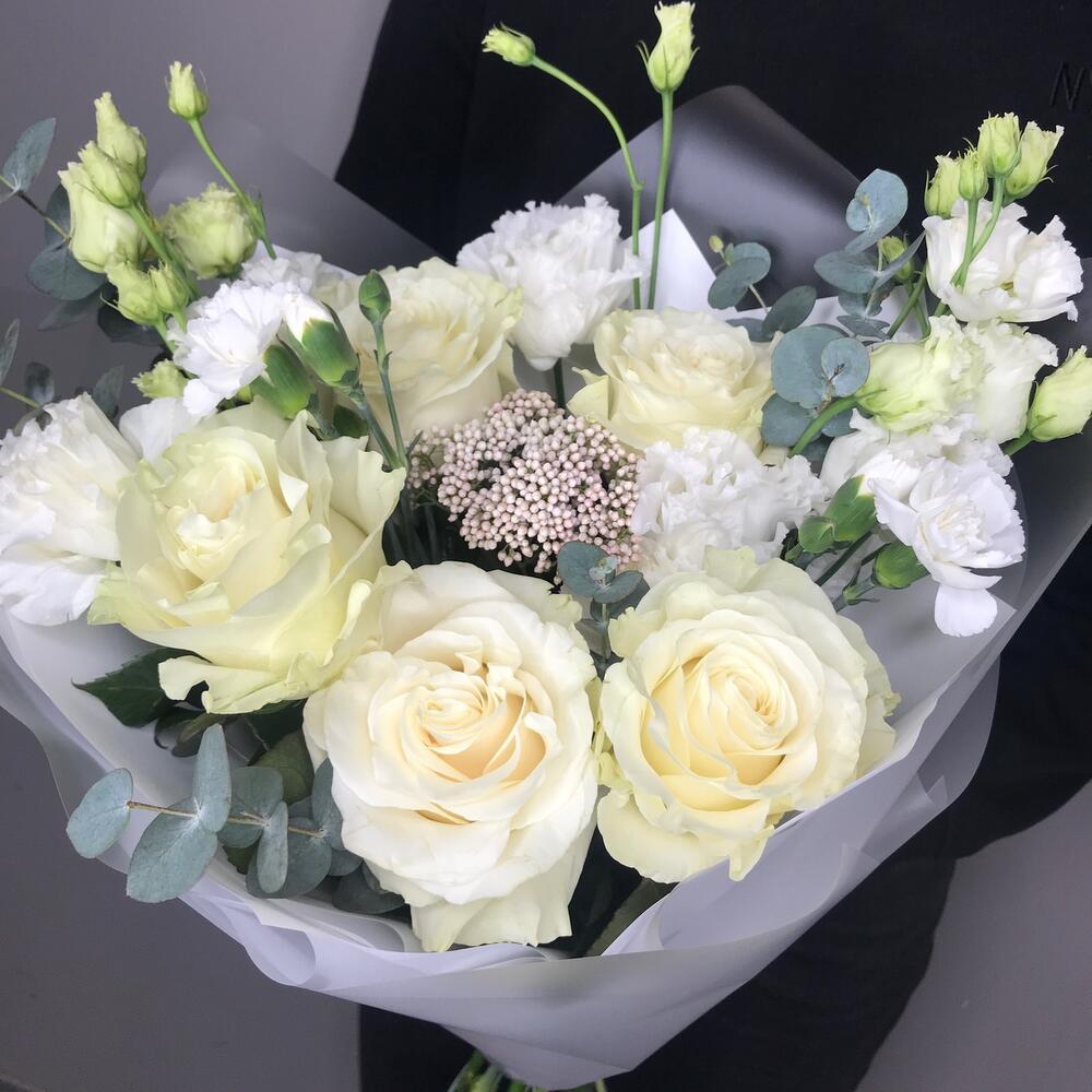 Лизиантус – 2 шт.Озотамнус – 1 шт.Эвкалипт – 2 шт.Гвоздика кустовая – 3 шт.Роза белая – 5 шт.Упаковка дизайнерская – 1 шт.комплимент от polyanka – 1 шт.