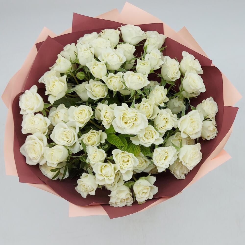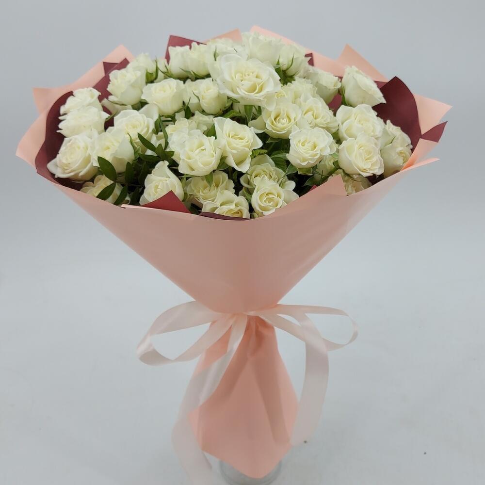 Нежные белые кустовые розочки в стильном оформлении. Такой букет всегда уместен и подойдёт для любого повода: День Рождения, именины, годовщина свадьбы, рождение ребенка, 8 марта, День Святого Валентина, выпускной и т.д. Можно вручить маме, сестре, подруге, коллеге, учителю, любимой.