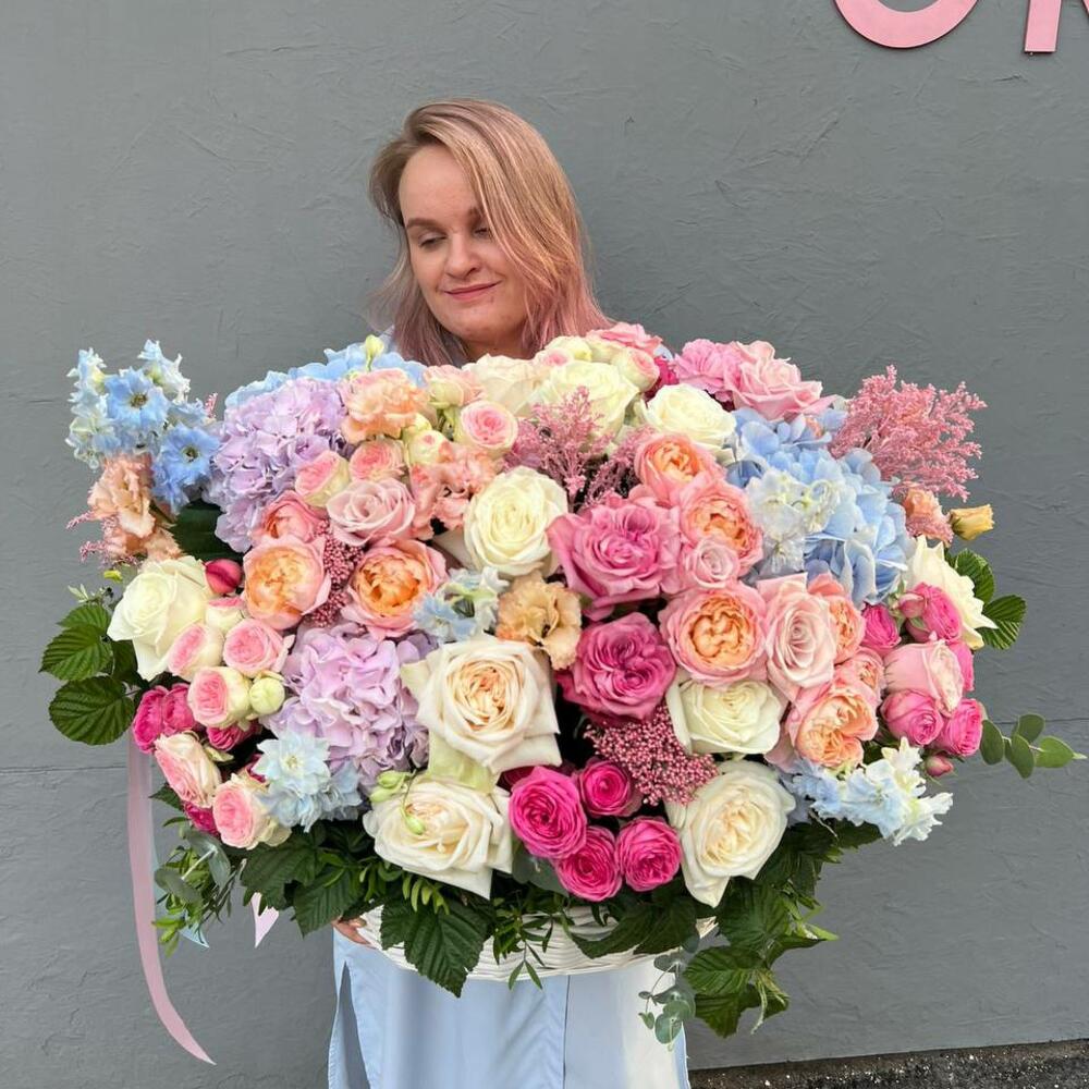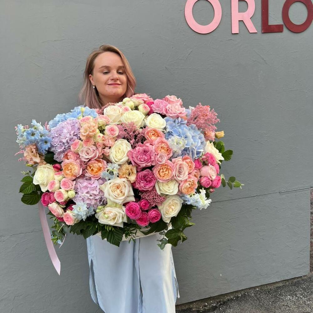 Гортензия – 5 шт.пион розы джульетта – 7 шт.Кустовая пионовидная роза – 5 шт.Кустовая роза – 7 шт.кустовая яркая роза – 5 шт.роза эскимо – 5 шт.Озотамнус – 5 шт.Эустома – 5 шт.Эвкалипт – 4 шт.Корзина – 1 шт.Оазис – 3 шт.однополая белая роза – 13 шт.одноголовая пионовидная роза кантри блю – 5 шт.Гвоздика – 11 шт.