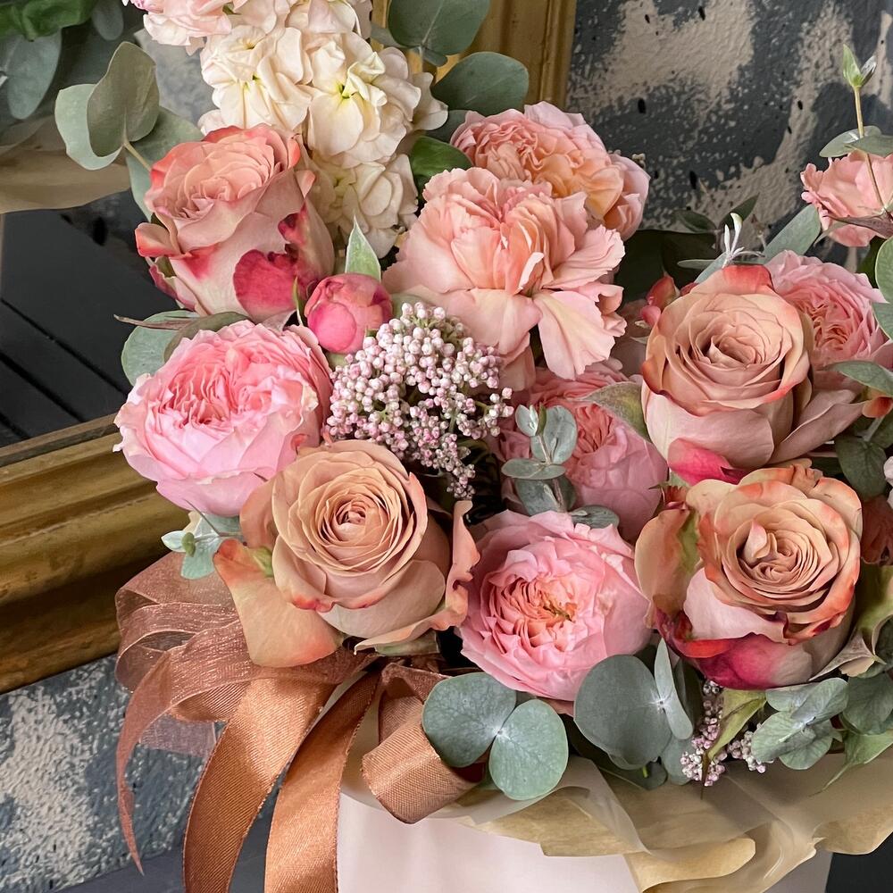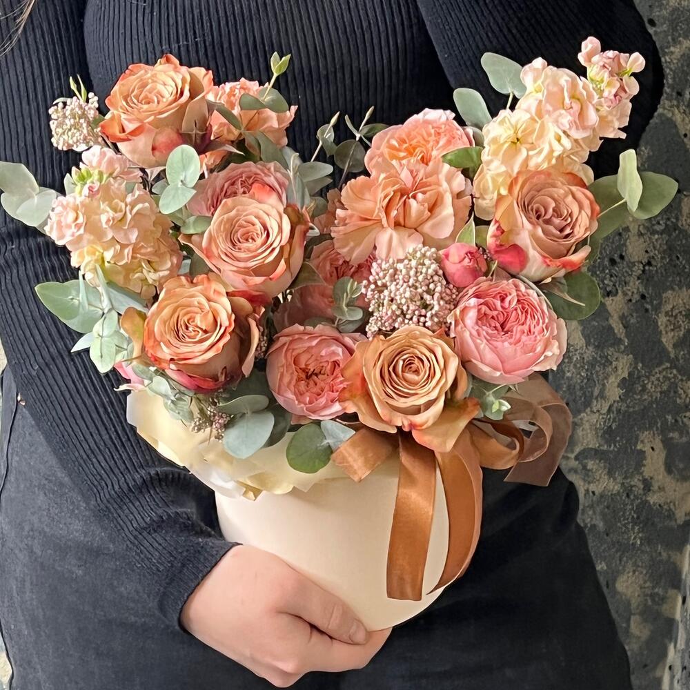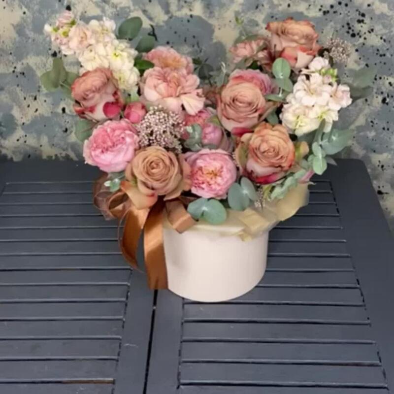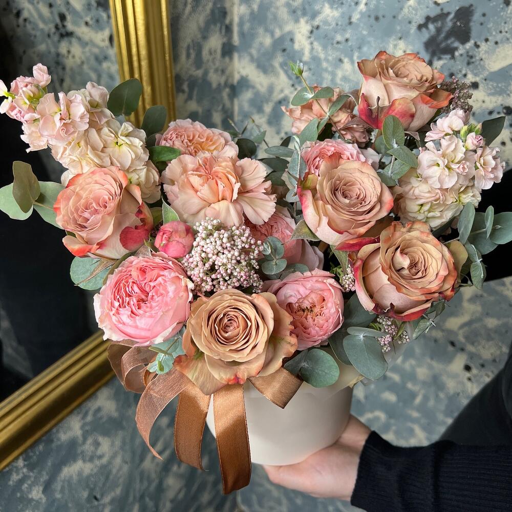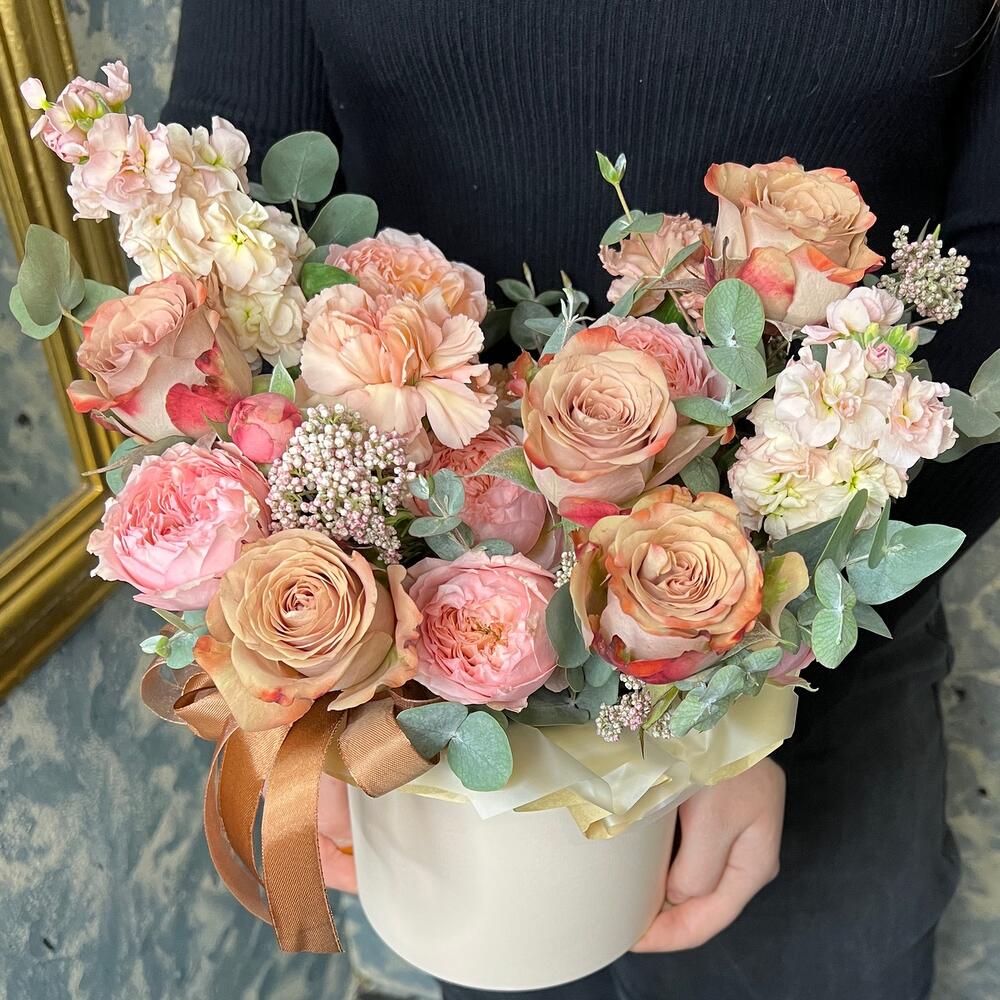 Роза Капучино – 5 шт.Маттиола – 2 шт.Роза кустовая пионовидная джульетта – 1 шт.Озотамнус – 2 шт.Диантус – 3 шт.Эвкалипт – 3 шт.Оазис флористический – 1 шт.бумага дизайнерская – 1 шт.Коробка шляпная – 1 шт.Лента атласная – 2 шт.