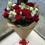 Букет из красных роз и белой эустомы, собранный в круглой форме и оформленный в крафт бумагу.