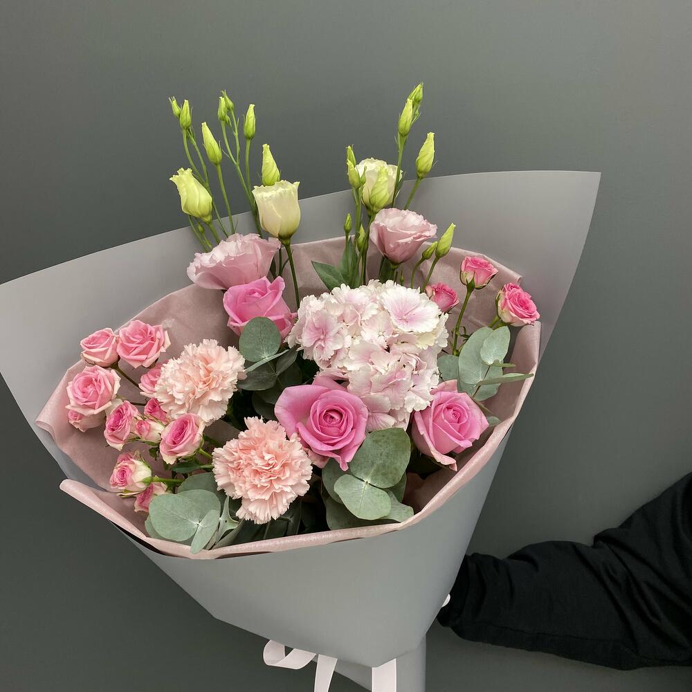 Альстромерии, Гвоздики, Кустовые розы, Лизиантусы, Розы, Хризантемы