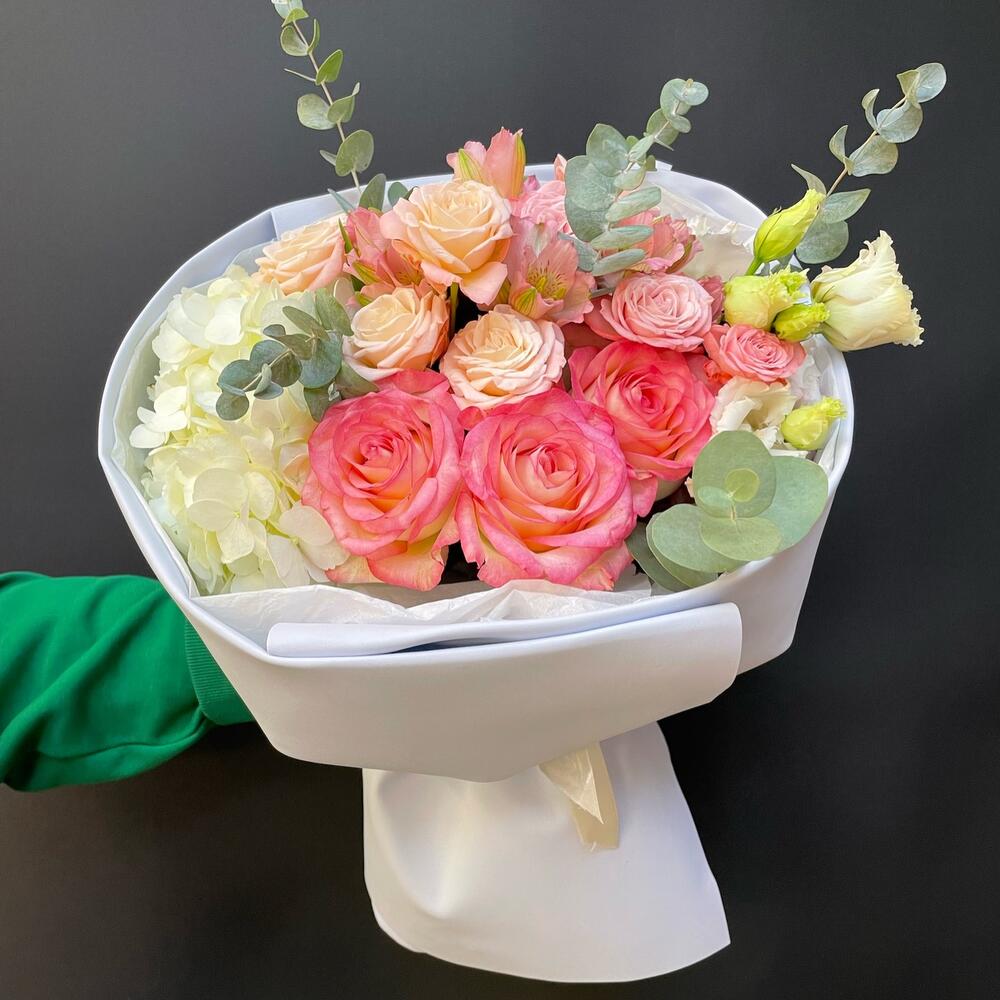 Альстромерия – 2 шт.Гортензия – 1 шт.Лизиантус – 2 шт.Эвкалипт – 2 шт.Роза – 3 шт.Кустовая роза – 3 шт.Лента атласная – 1 шт.Тишью – 2 шт.Упаковка дизайнерская – 1 шт.