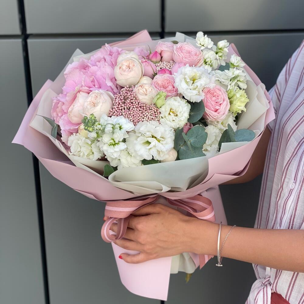 Букет Филинг из гортензии, пионовидной розы, озотамнуса и маттиолы