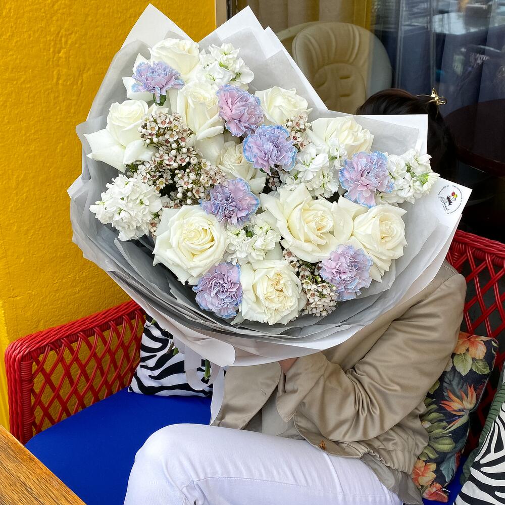 Роза – 10 шт. Маттиола – 5 шт. гвоздика эксклюзив – 7 шт. Ваксфлауэр – 4 шт.