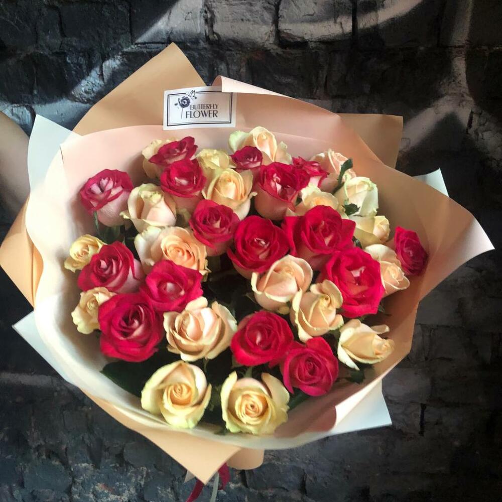 Букет из 35 красных и кремовых роз в стильной упаковке “Красно-кремовое боке”