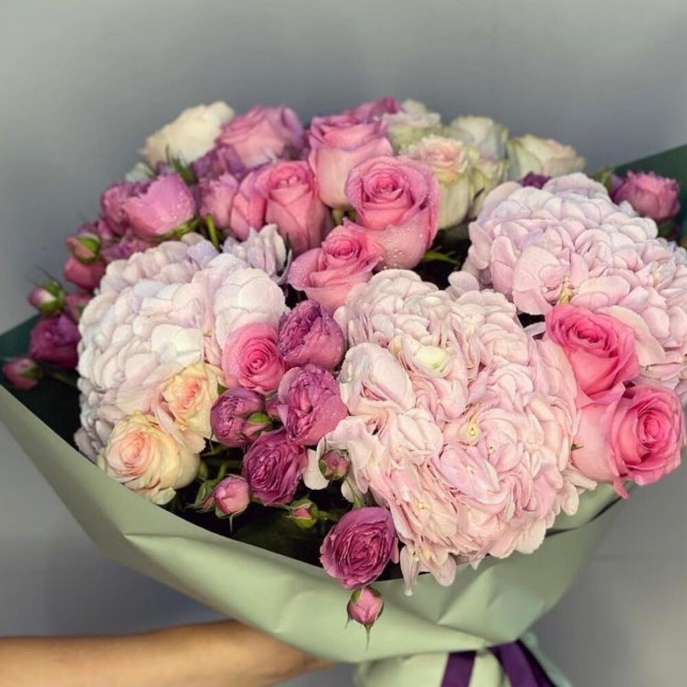 роза ассорти – 25 шт.Гортензия розовая – 4 шт.Упаковка дизайнерская – 1 шт.Лента атласная – 2 шт.Открытка – 1 шт.инструкция по уходу за цветами – 1 шт.хорошее настроение – 100 шт.коробка переноска – 1 шт.Кризал – 1 шт.