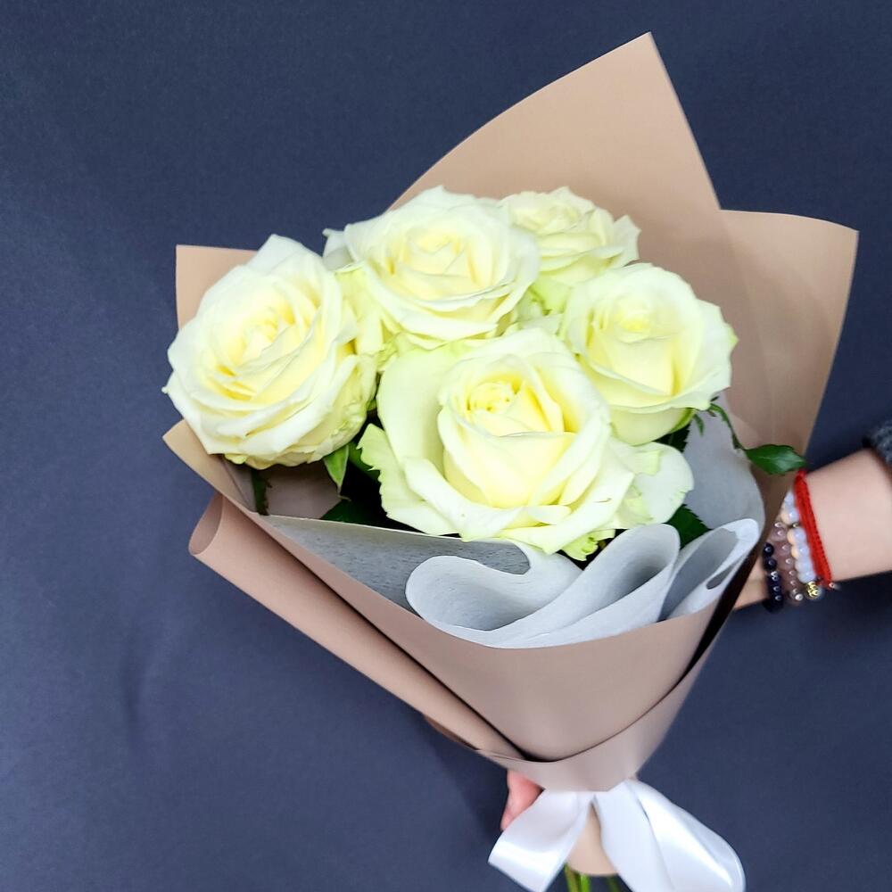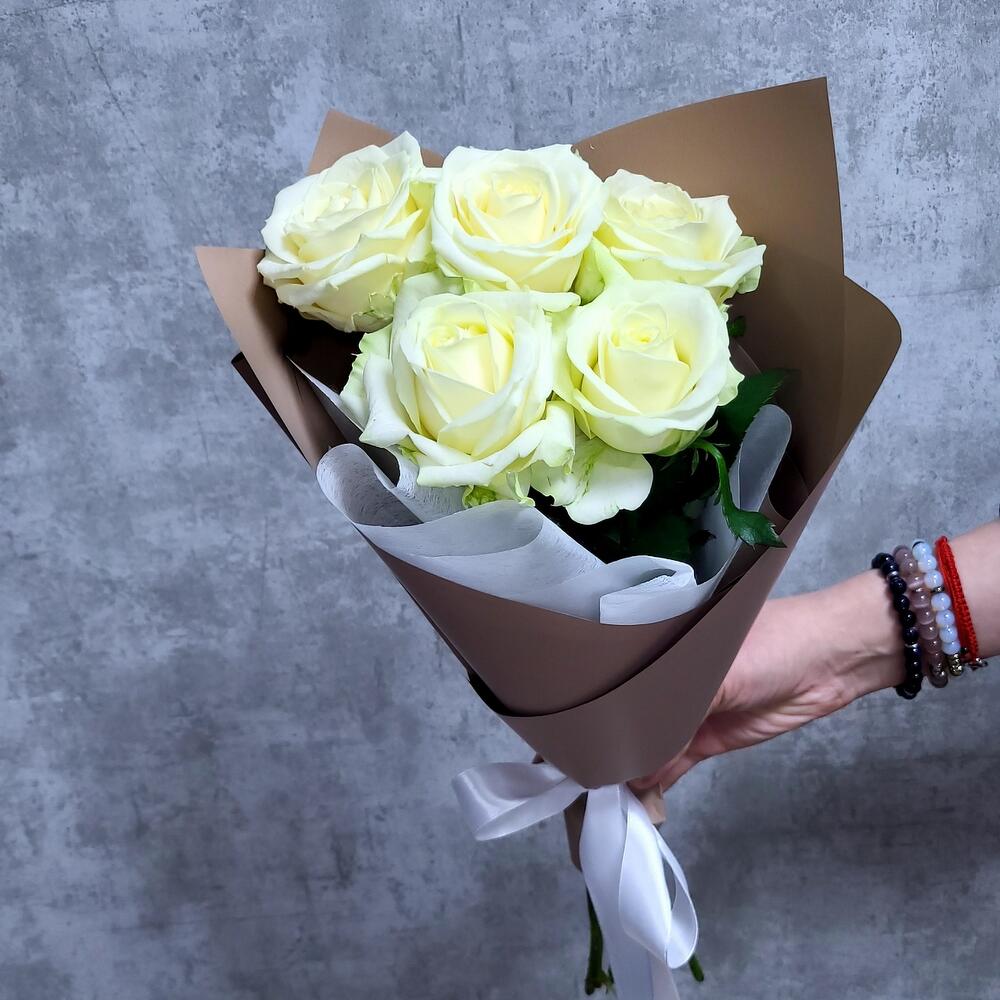 Эвкалипт – 2 шт.Лента атласная – 2 шт.Роза белая – 5 шт.Упаковка дизайнерская – 1 шт.