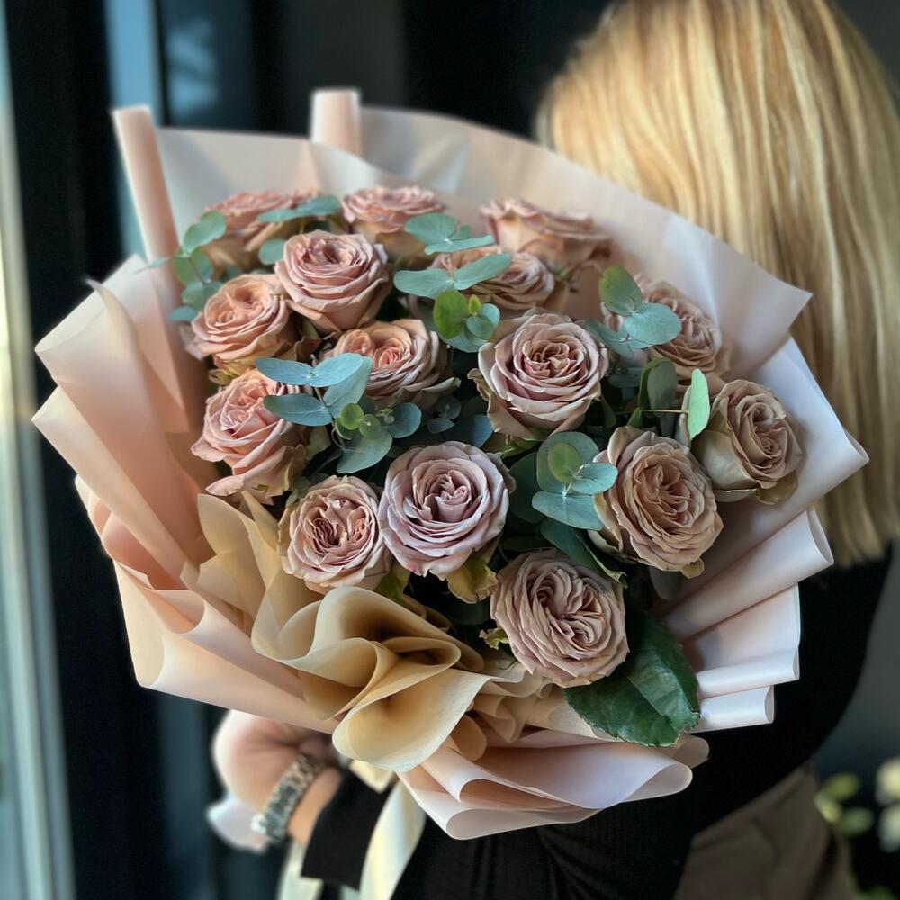 Эвкалипт – 4 шт.Роза одноголовая – 15 шт.Лента атласная – 1 шт.Упаковка дизайнерская – 2 шт.