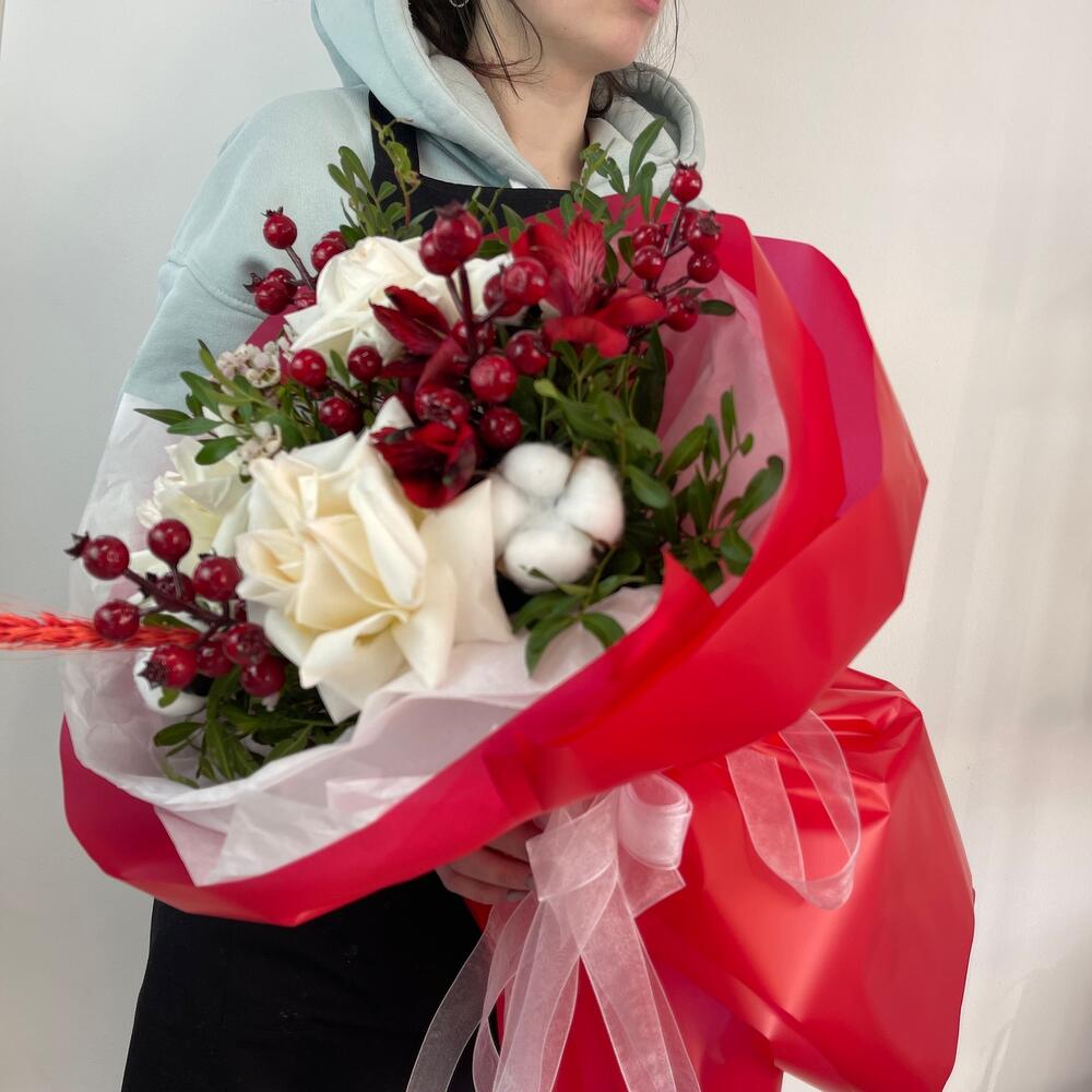 Альстромерия – 1 шт.Роза Охара – 3 шт.Пленка матовая – 6 шт.Хлопок натуральный – 3 шт.Хамелациум белый – 1 шт.фиисташка – 5 шт.ягода декор – 5 шт.