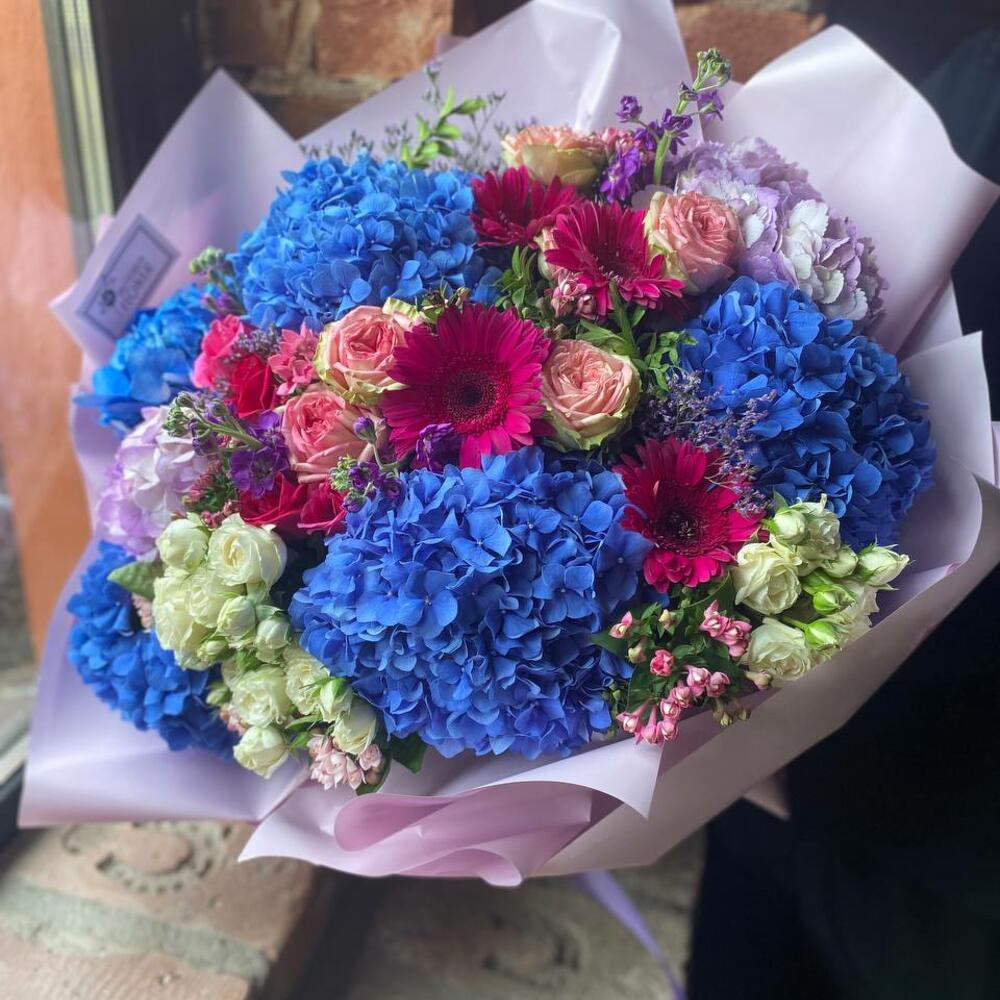 Букет из гортензии, кустовых роз, бовардии, лимониума, гербер и маттиолы в стильной упаковке “Джулия Робертс”