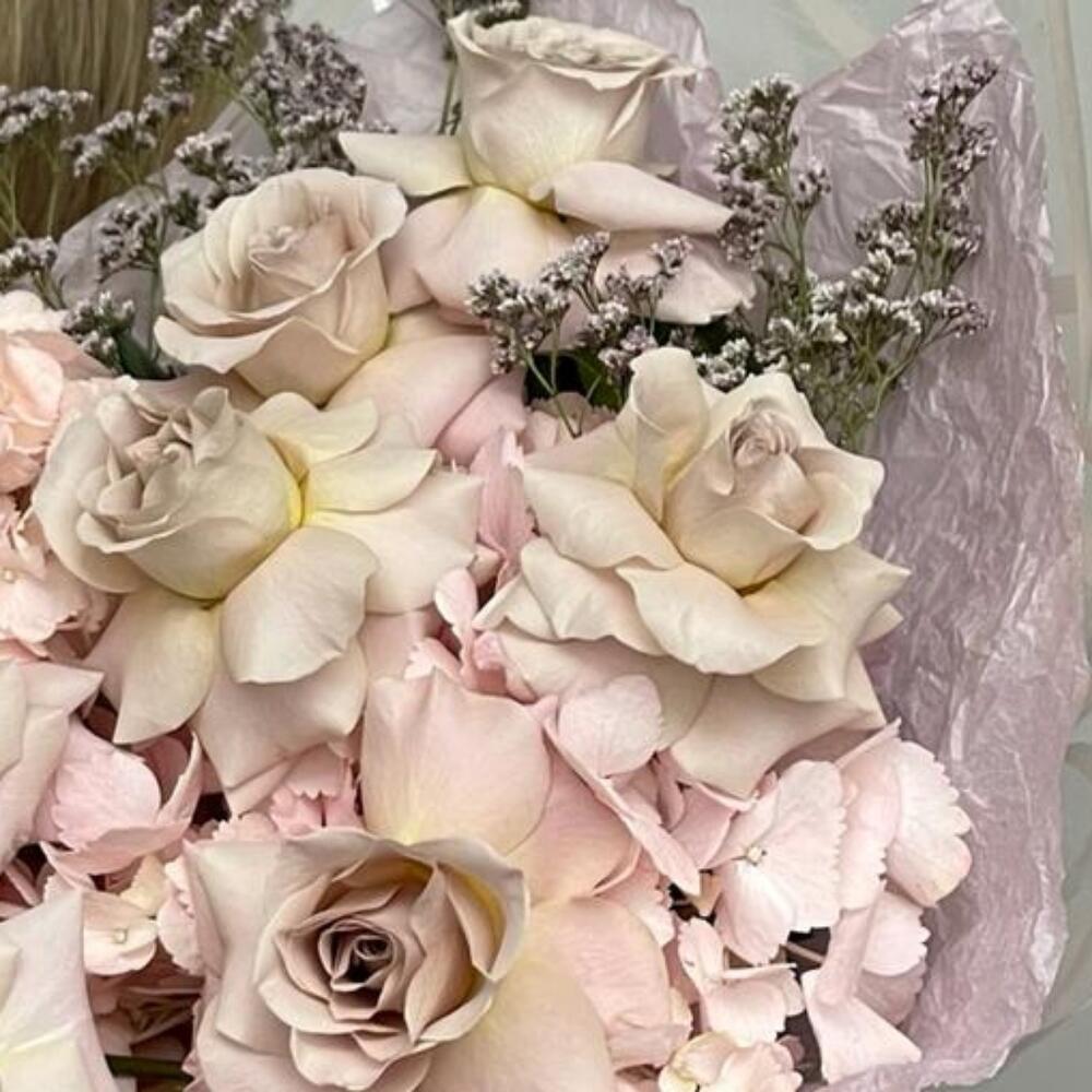 Гортензия – 2 шт.Лимониум – 2 шт.Роза – 7 шт.Упаковка дизайнерская – 4 шт.