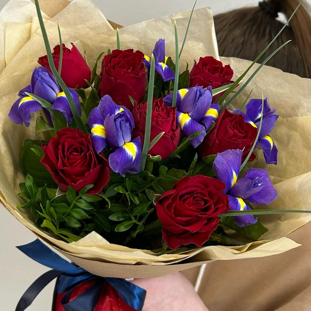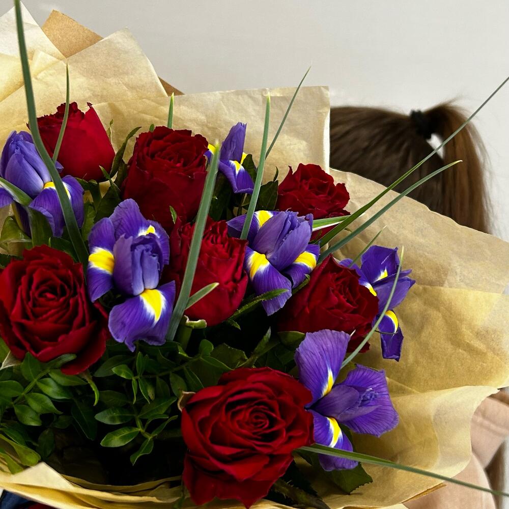 Букет из красных роз и фиолетовых ирисов