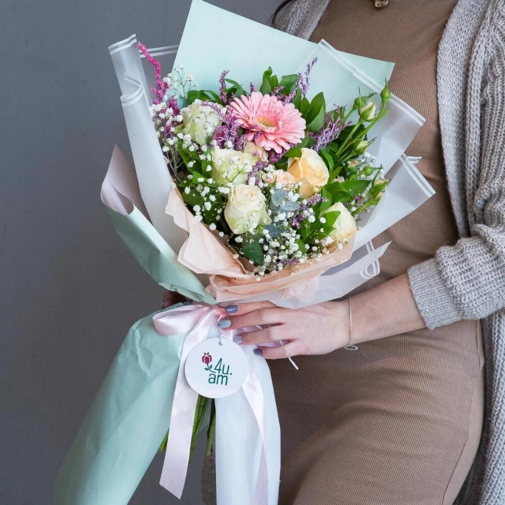 Гипсофила – 1 шт. Роза – 5 шт. Кустовая роза – 1 шт. Гербера – 1 шт.