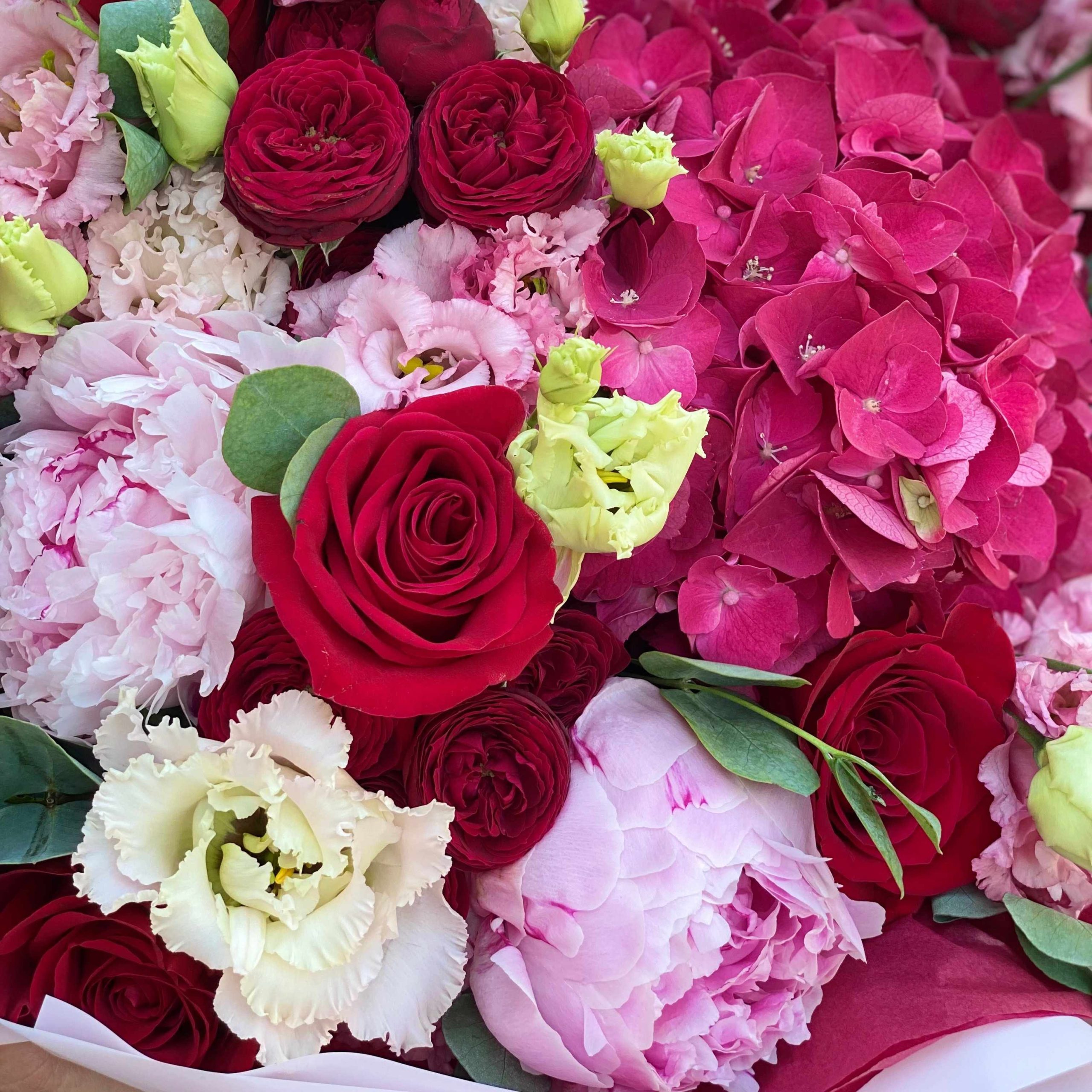 Альстромерии, Гвоздики, Кустовые розы, Лизиантусы, Розы, Хризантемы